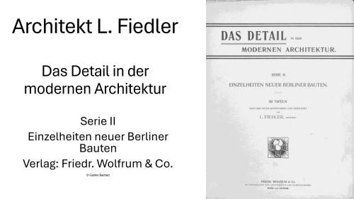 Der „Vorfilm“ zu dem Vortrag „Das Werk Alfred Messels unter besonderer Berücksichtigung seiner Warenhausarchitektur “ vorgetragen von Herrn Dr. Robert Habel gezeigte Berliner Architekturentwürfe „Das Detail in der modernen Architektur“ herausgegeben von Architekt L. Fiedler im Verlag Friedrich Wolfrum & Co. zeigt Entwürfe der Architekten Zaar & Wahl, Vollmer & Jassoy, Professor Otto Rieth, Schulz und Schlichting, Kristeller und Sonnenthal, Cremer & Wolfenstein, Professor A. Messel, Ludwig Hoffmann, Bruno Möhring, Alfred Grenander u. a. m.......Die Unterlage können Sie durch Anklicken des nachfolgenden Links aufrufen (20251020 A). Bitte hier anklicken.